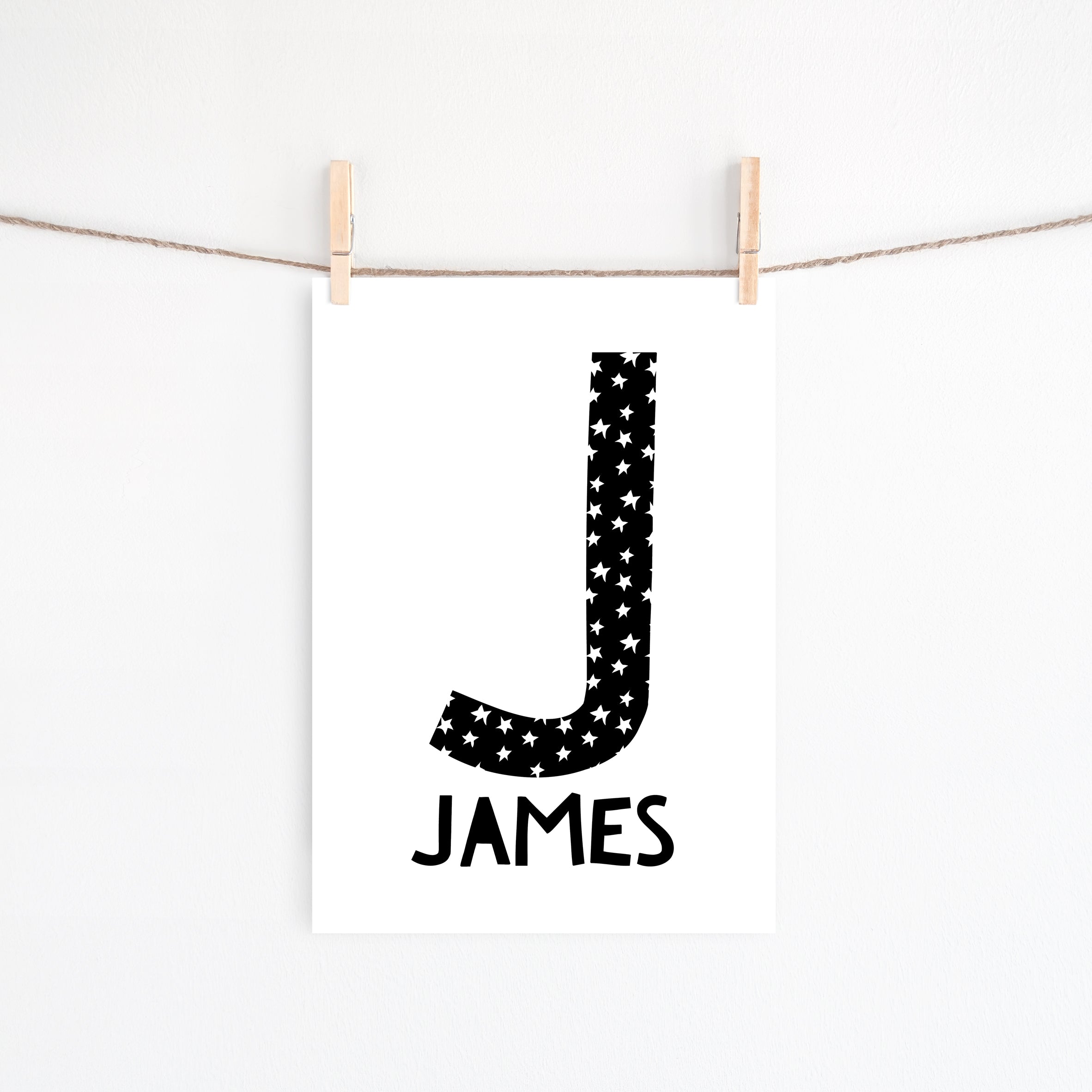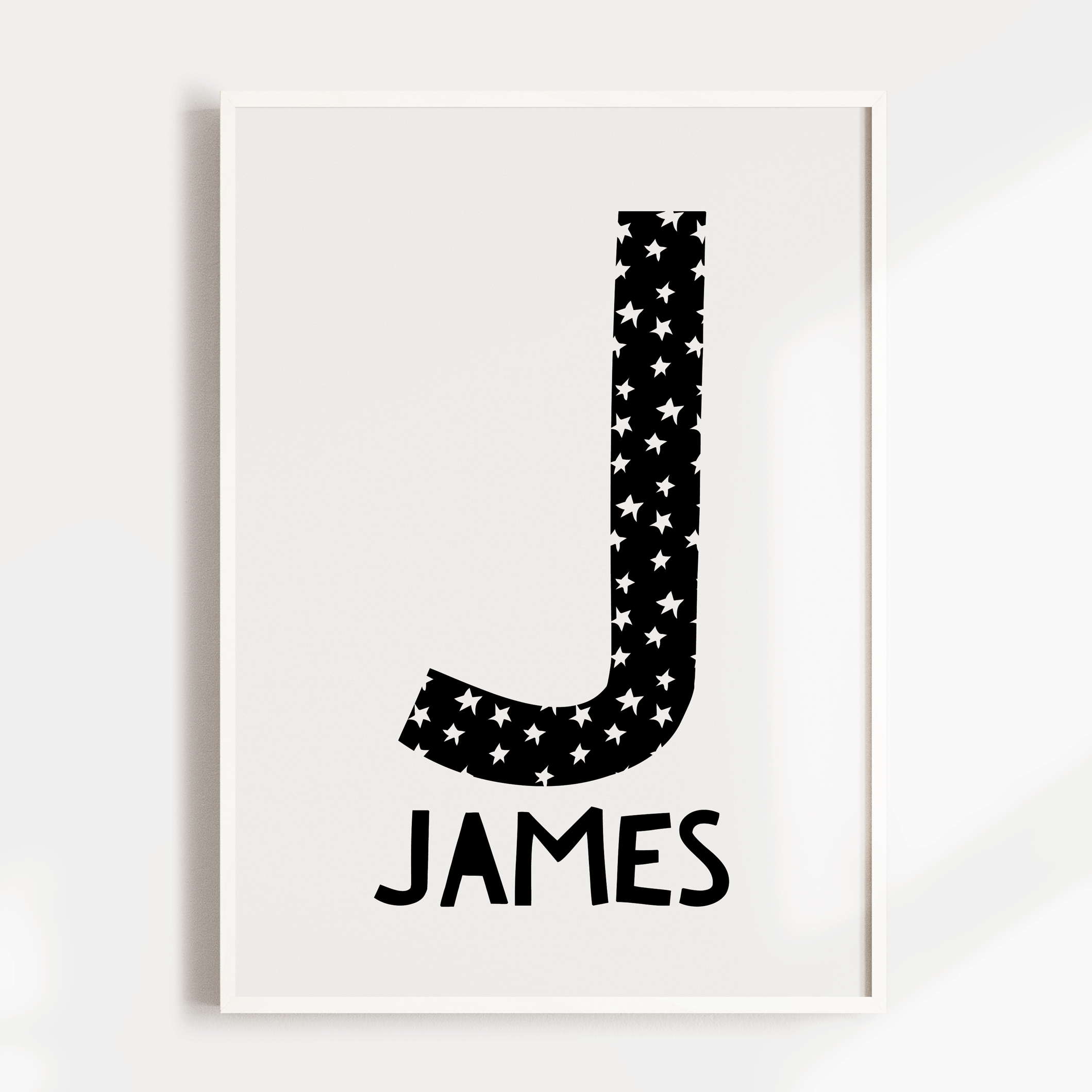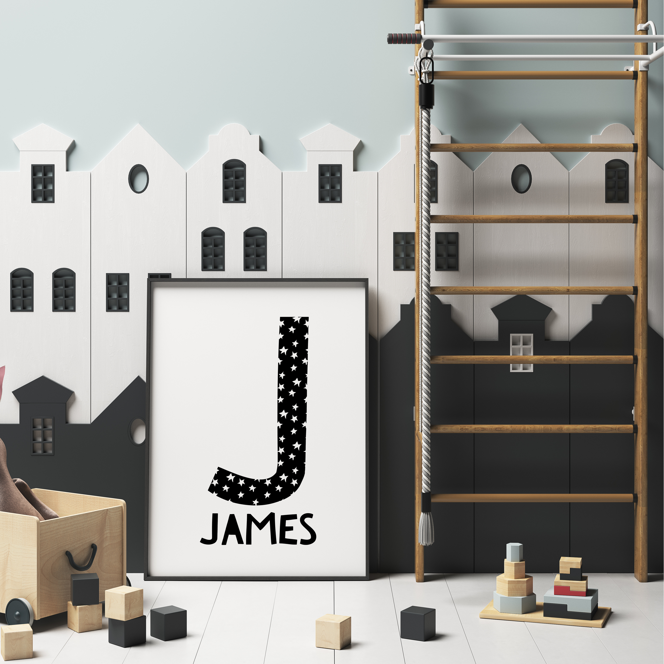Kids customised letter and name wall art print, a statement piece for the monochrome nursery or bedroom decor.