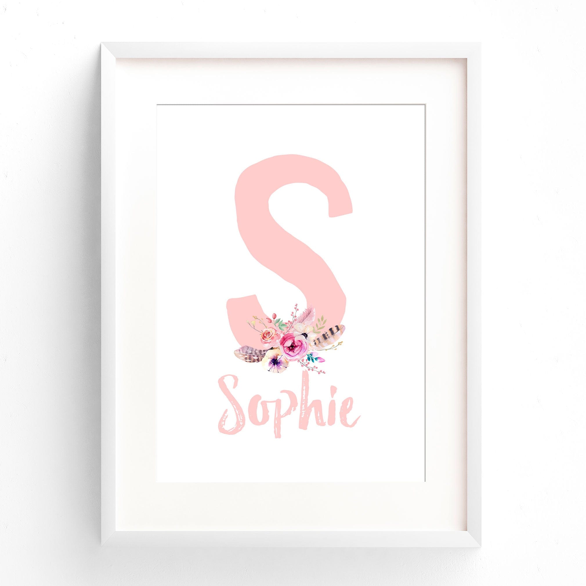 A customised wall art print, personalised with your child's name, featuring a watercolour feather and floral bouquet.