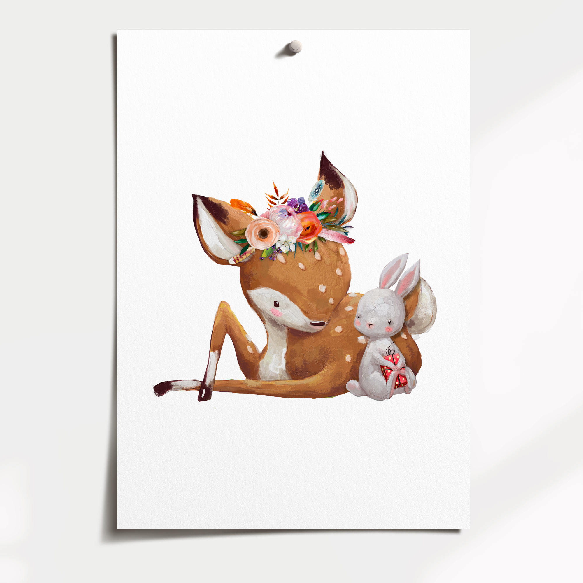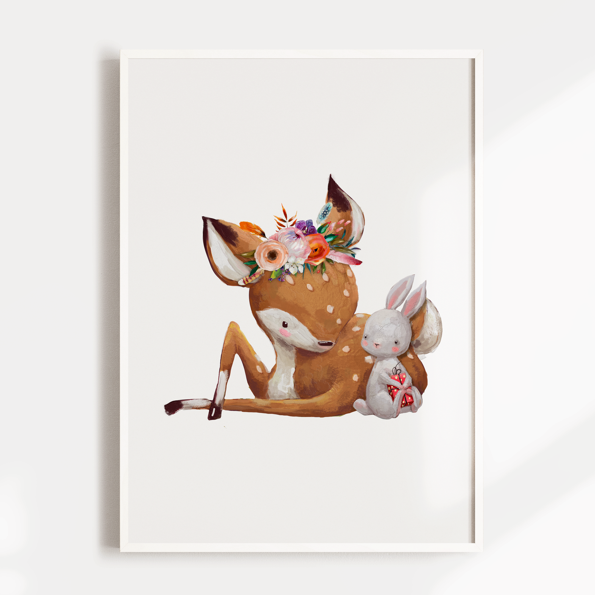 Perfect for the woodland nursery, bedroom or playroom decor, is this sweet floral baby deer & bunny wall art. Use as a stand alone piece in your little girl's special space or co-ordinate with our other prints from this range.