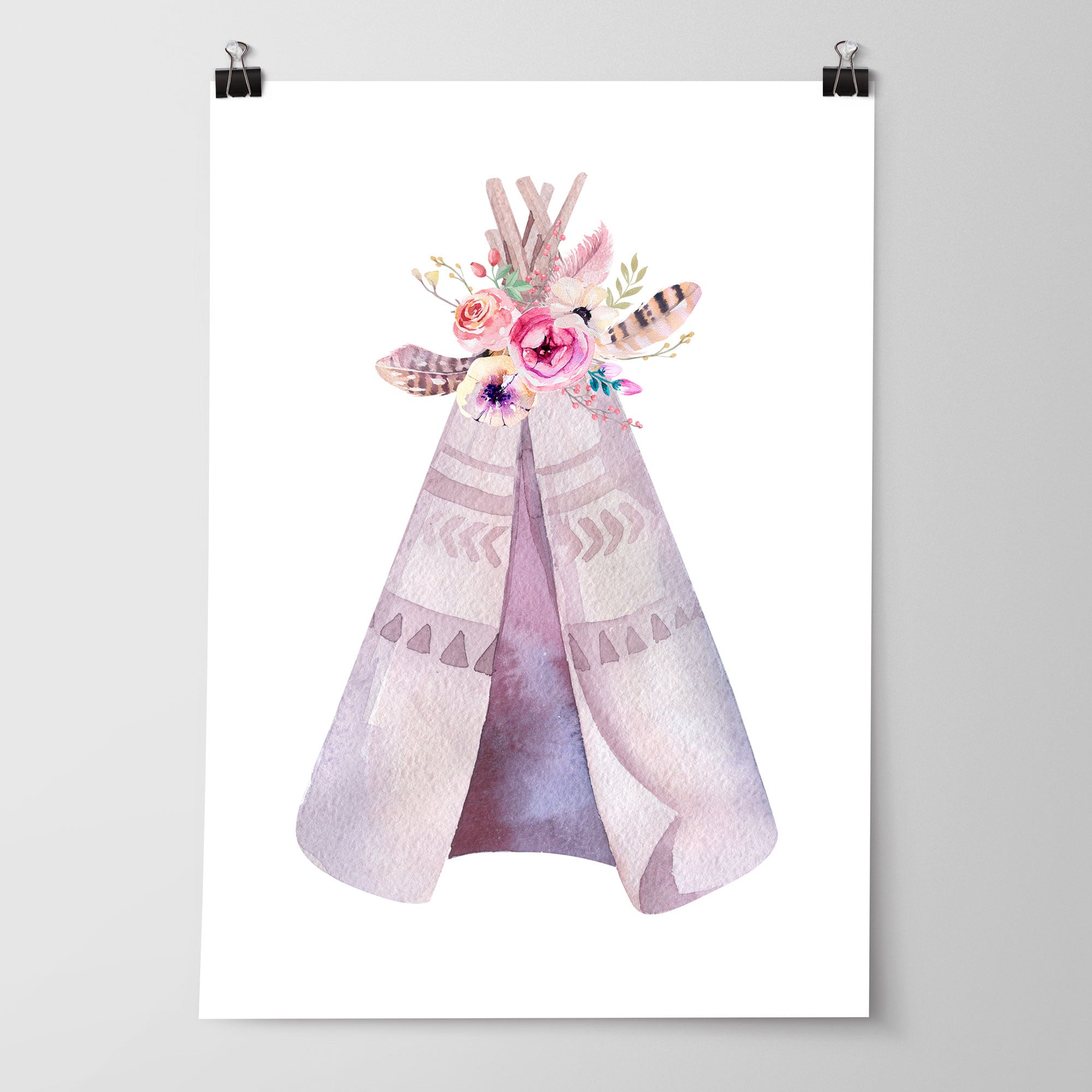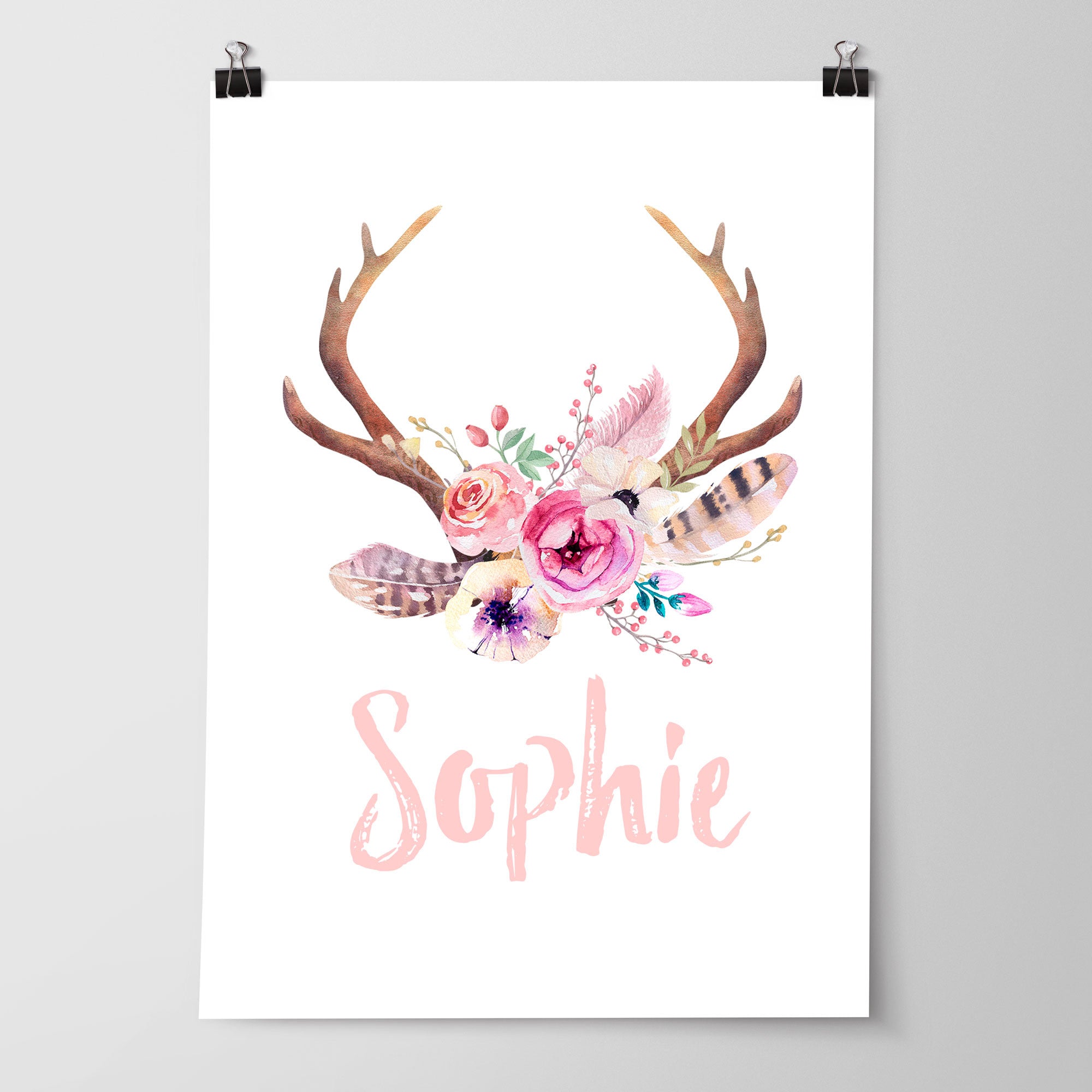 A boho nursery wall art print set that includes a floral watercolour teepee print, a pink arrows print and a personalised floral antler name print.