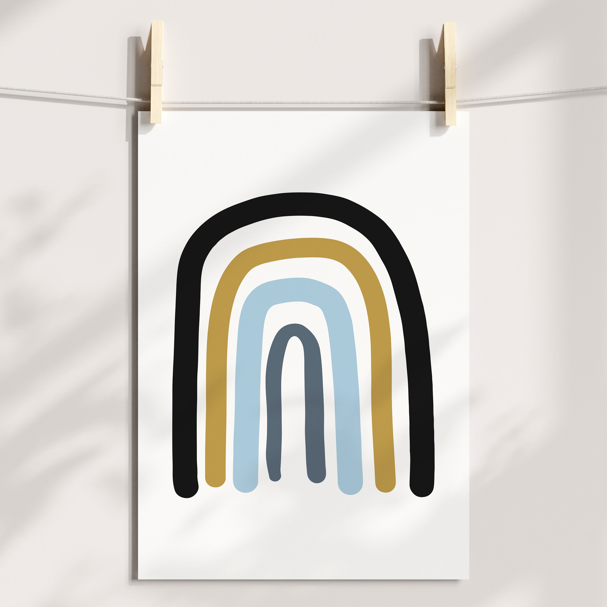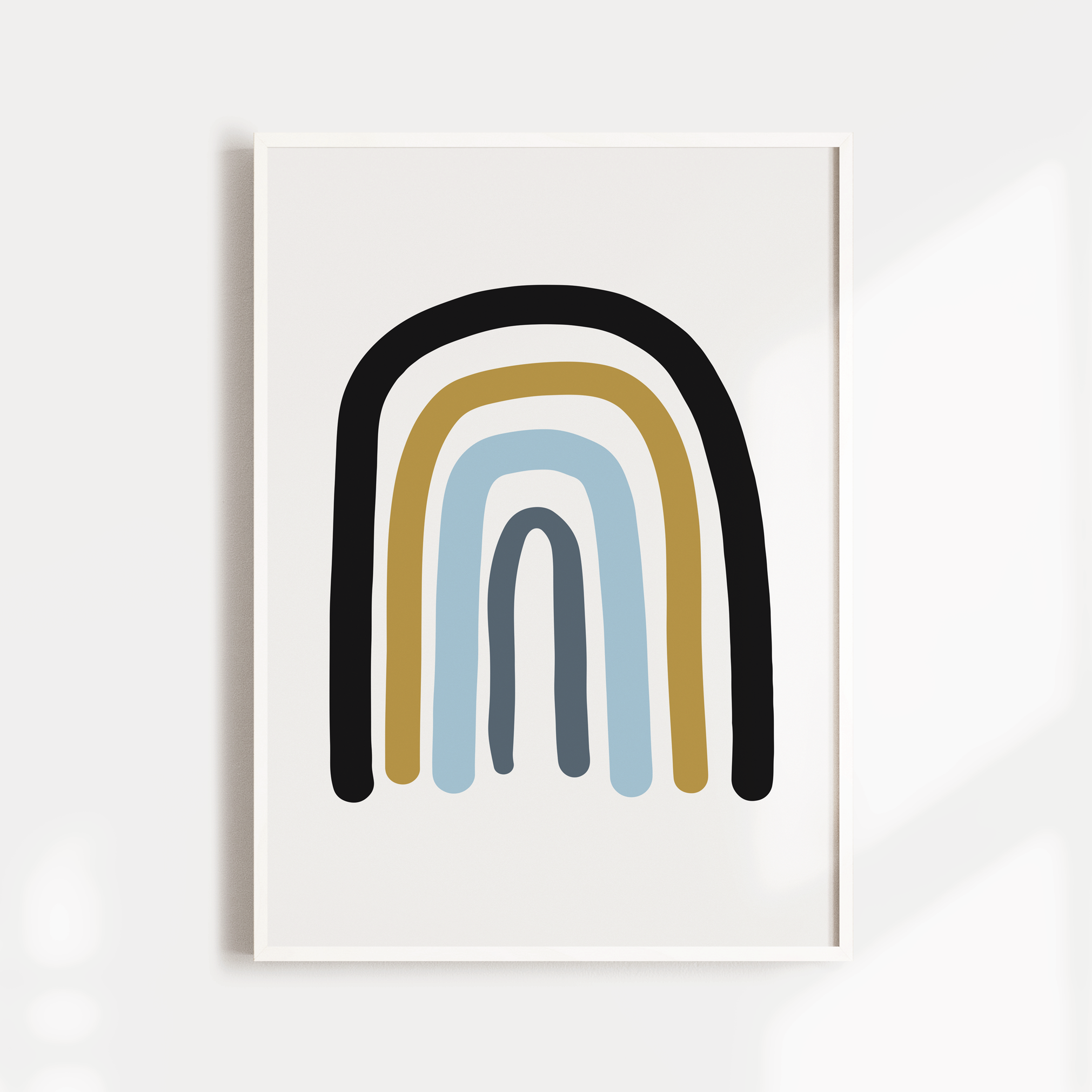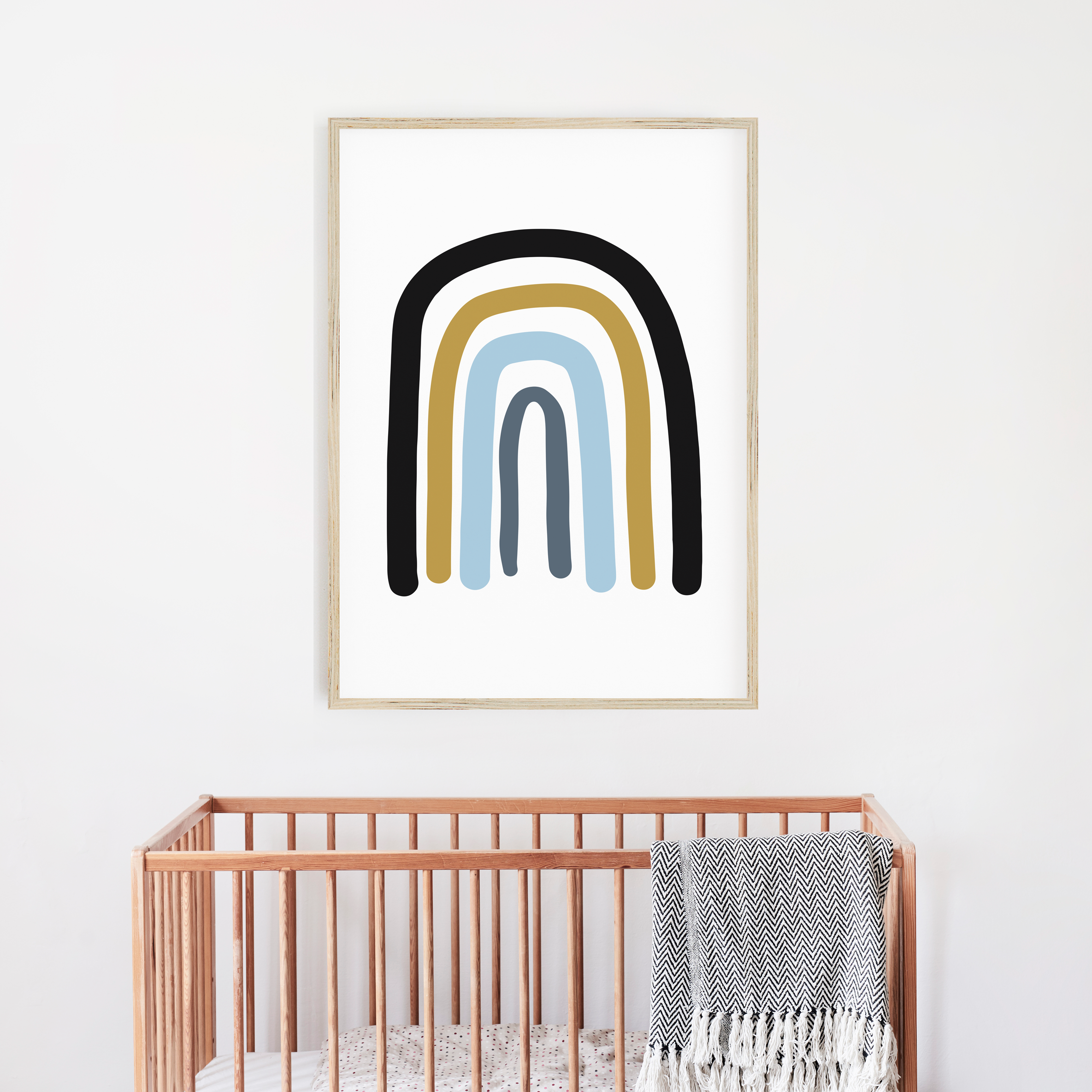The perfect print for the modern nursery, bedroom or playroom, this scandi inspired rainbow art print features black mustard & soft blues, suitable for both boys and girls rooms of any age. Also makes a great new baby gift.