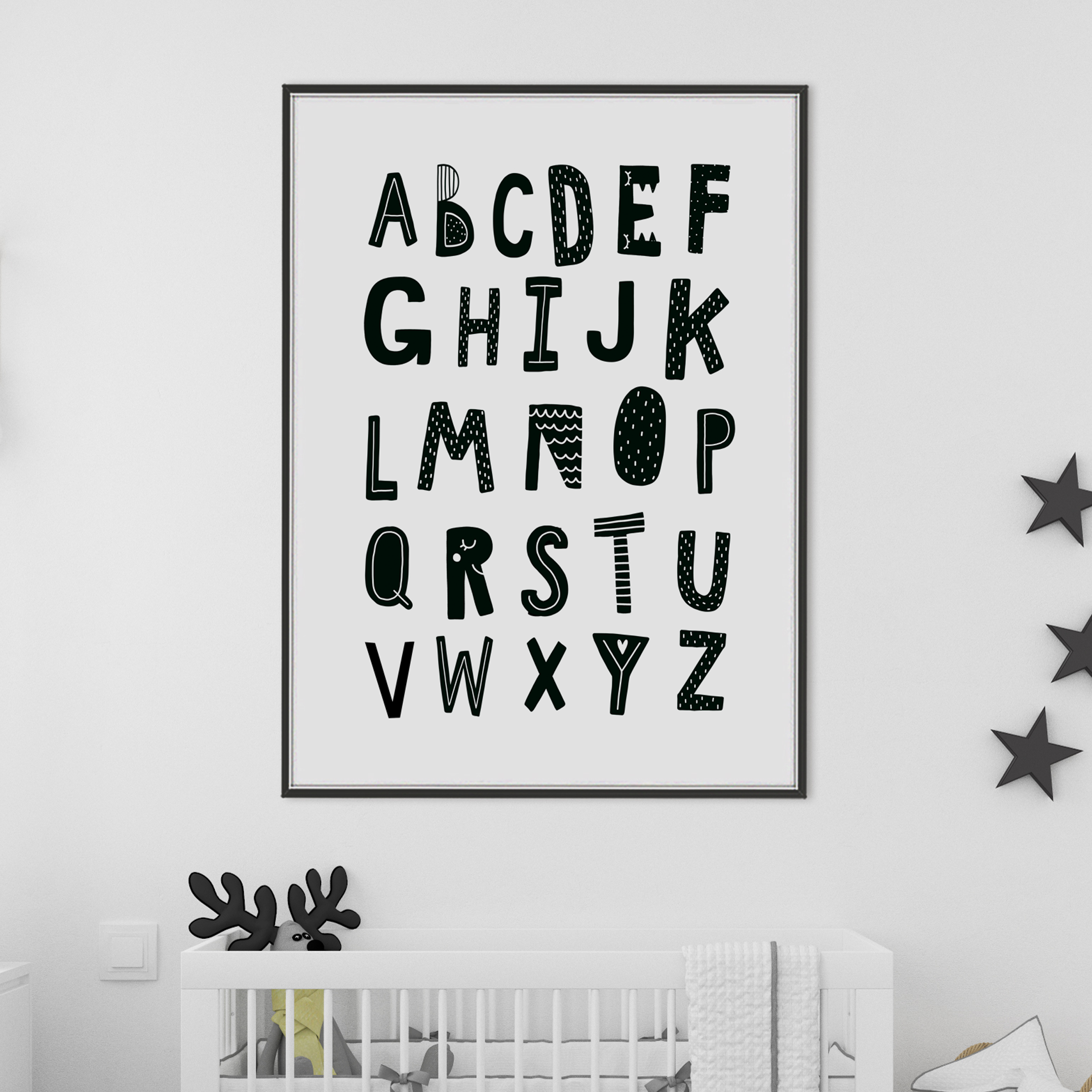 A  set of three scandi, inspired bedroom wall art prints just for the boys. Featuring a jungle lion, bear and monochrome alphabet print.