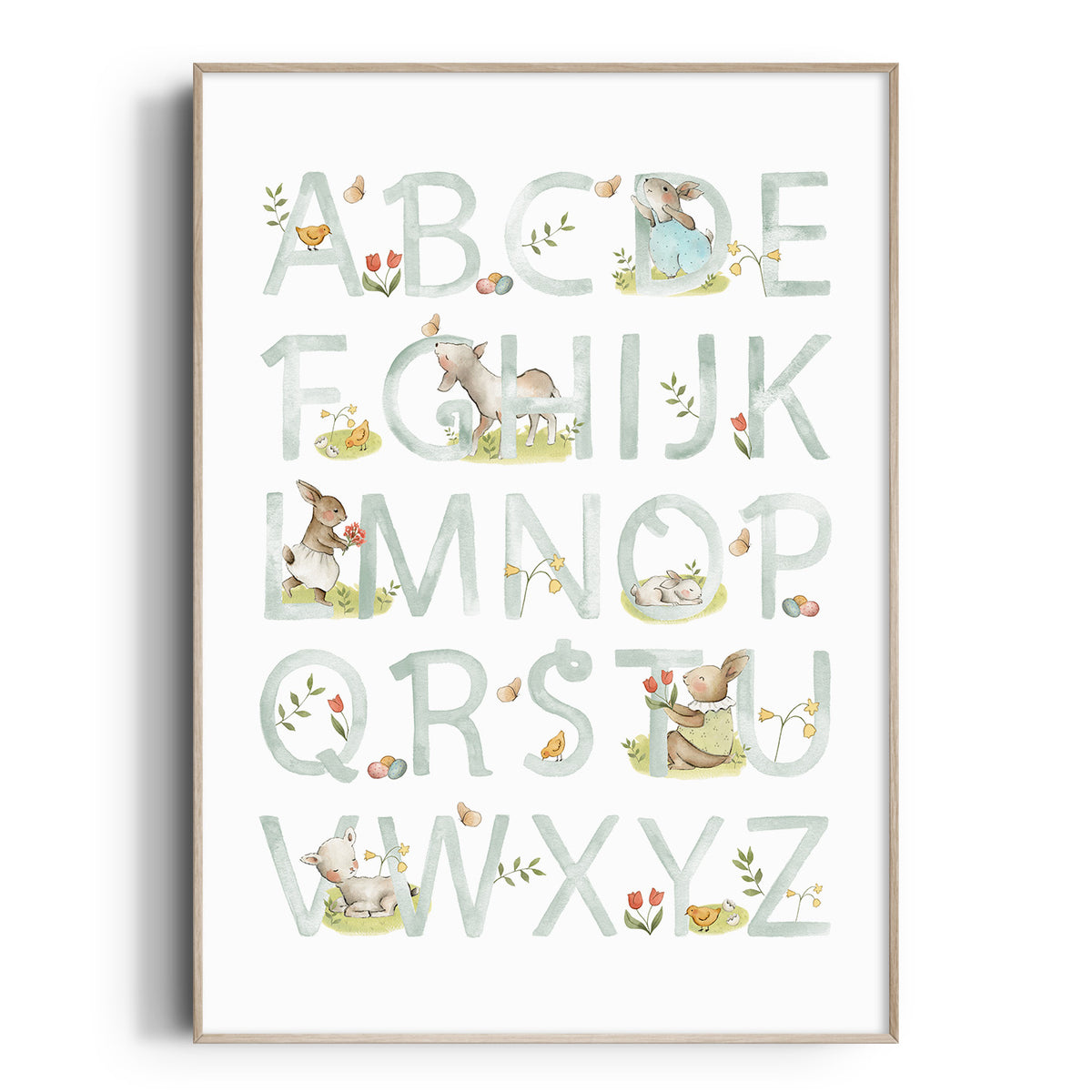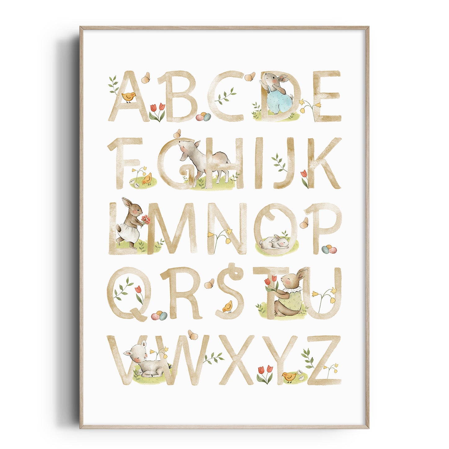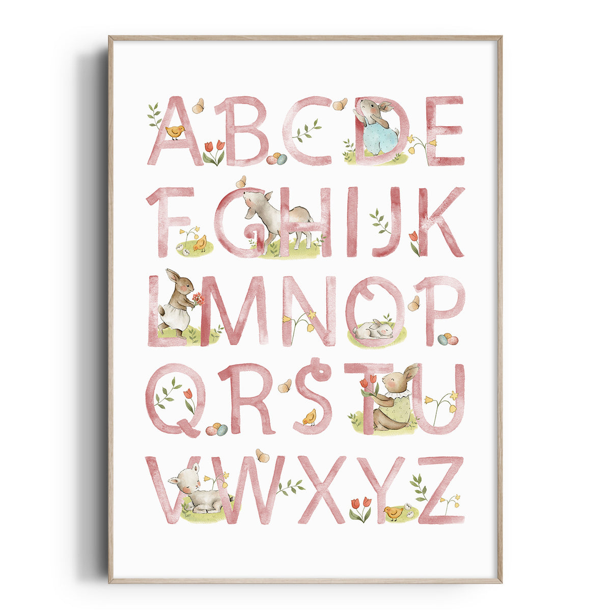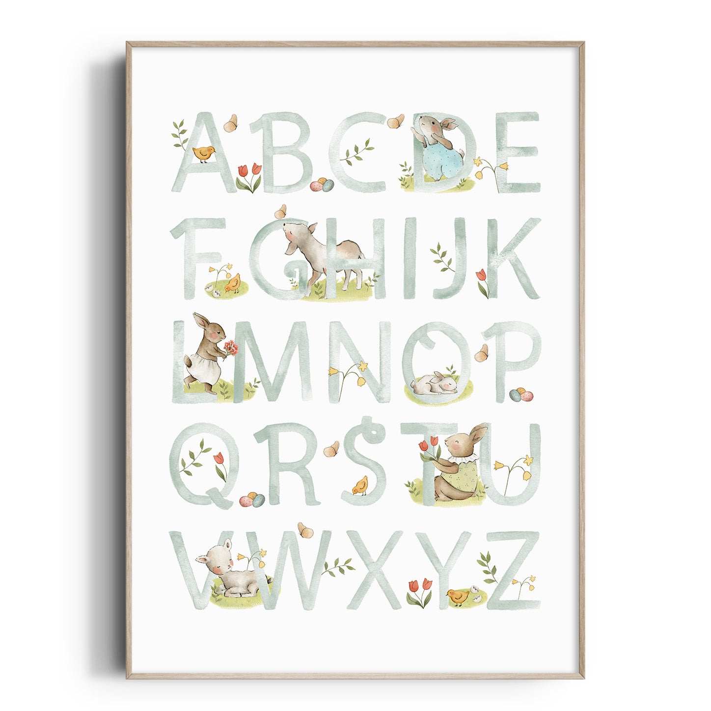 Hop into learning with this delightful alphabet print featuring spring's cutest creatures. Each letter comes to life with bunnies, lambs, and other gentle animals, turning the alphabet into a cheerful visual adventure. Perfect for nurseries and playrooms, this educational print makes learning letters fun while adding a touch of springtime warmth to any child's space. Beautifully designed with a gallery-quality finish, it's the ideal way to inspire curiosity and early literacy skills.