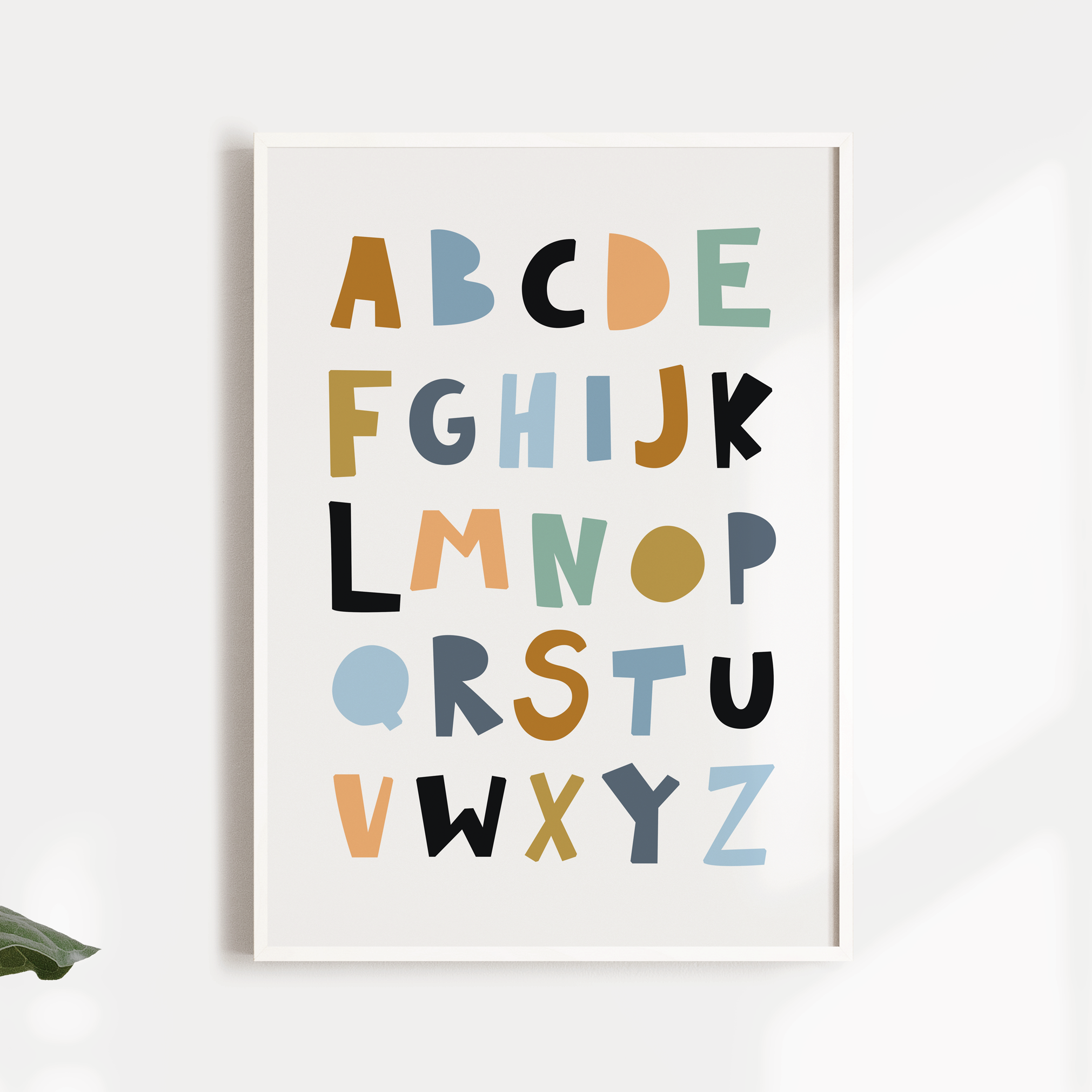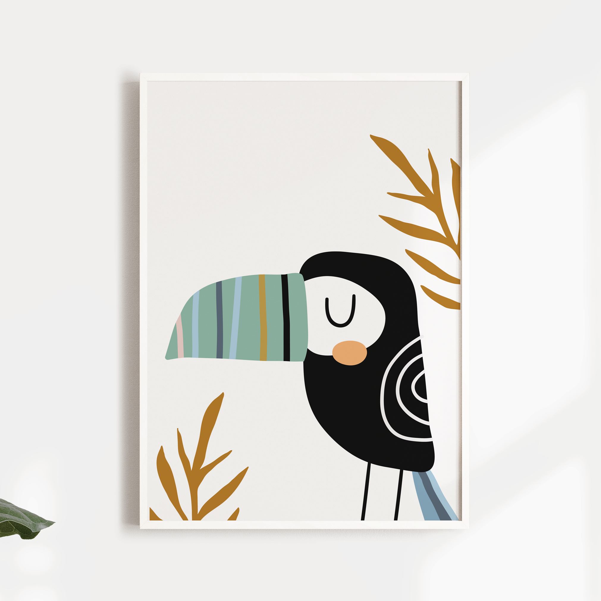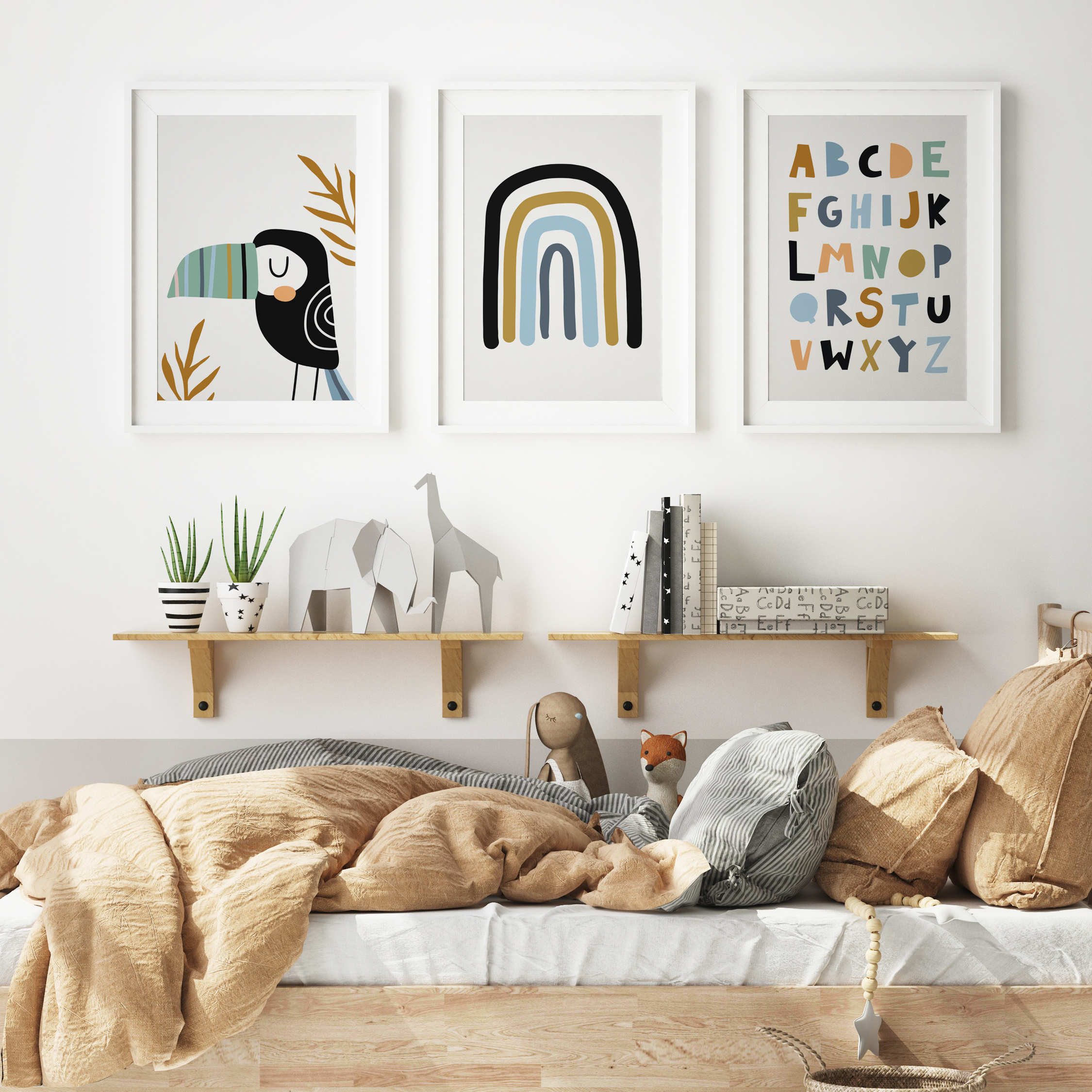 A  set of three scandi, inspired kids nursery or bedroom wall art prints, featuring  tropical toucan, rainbow and alphabet prints.