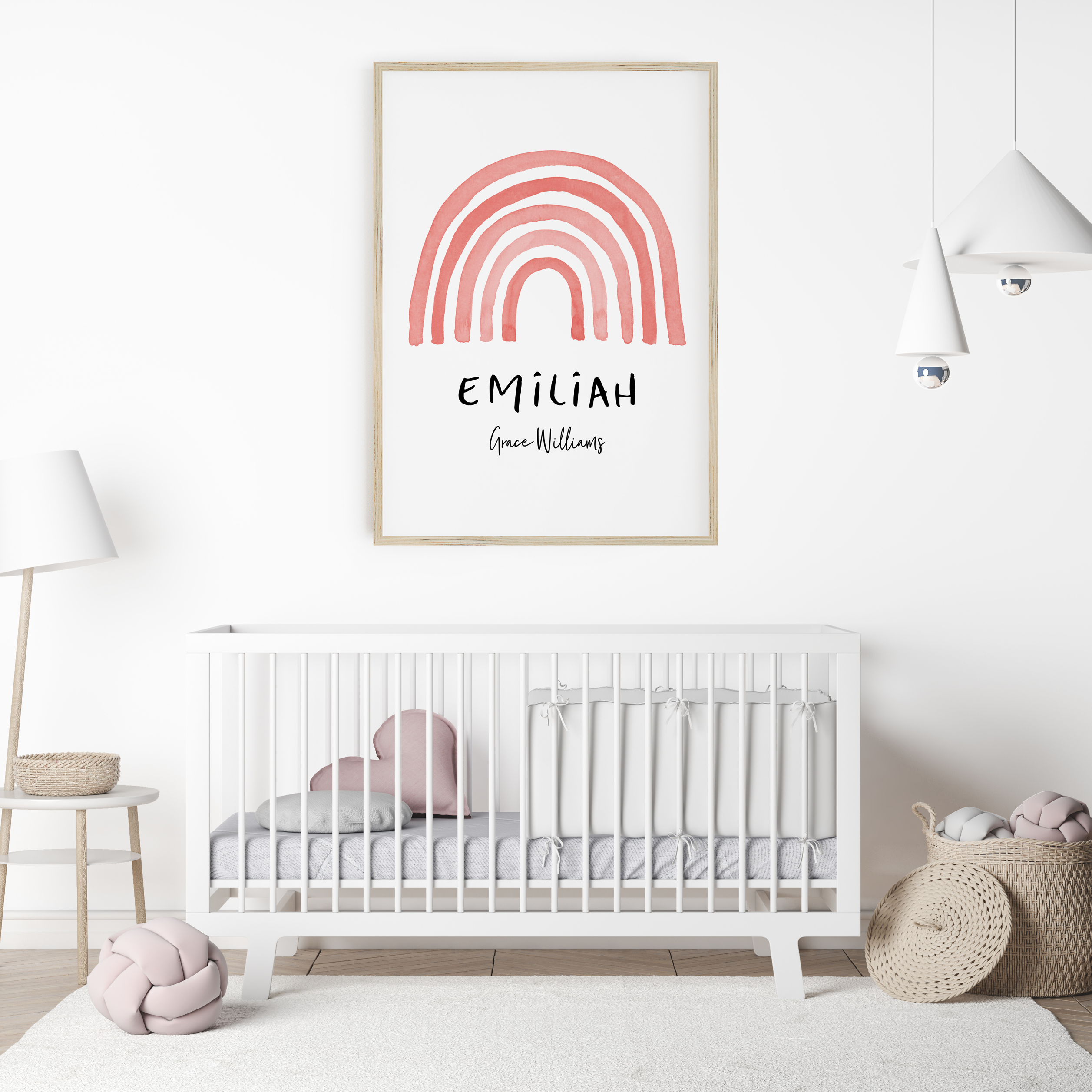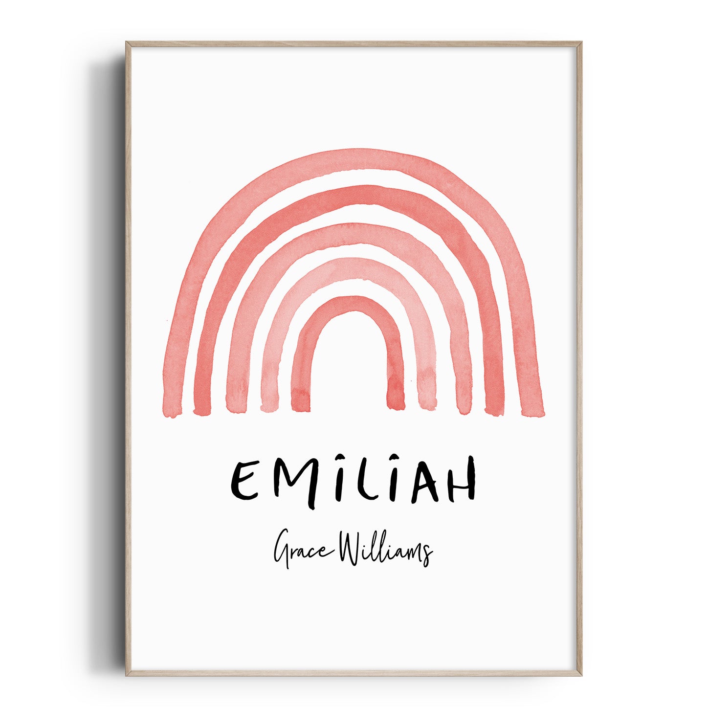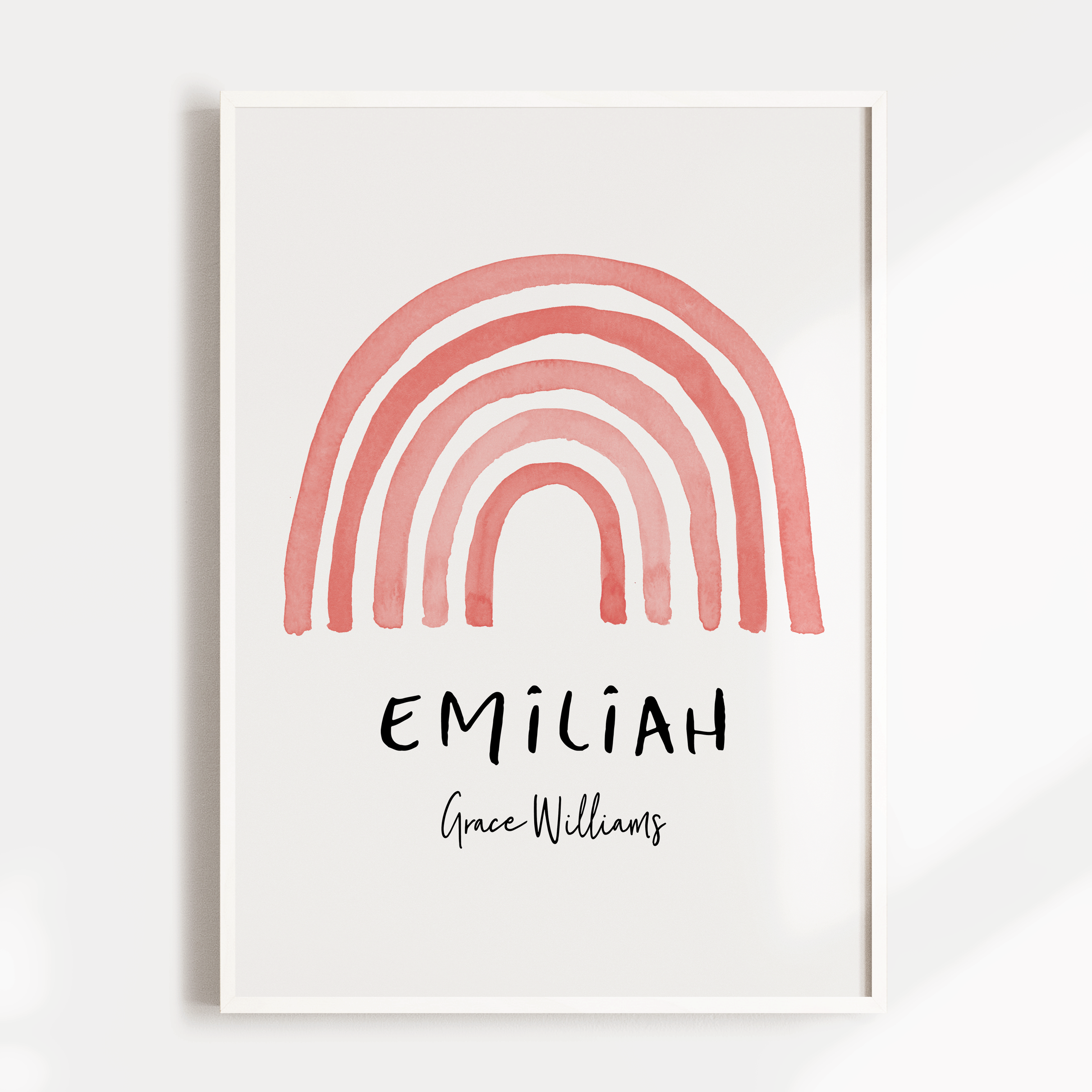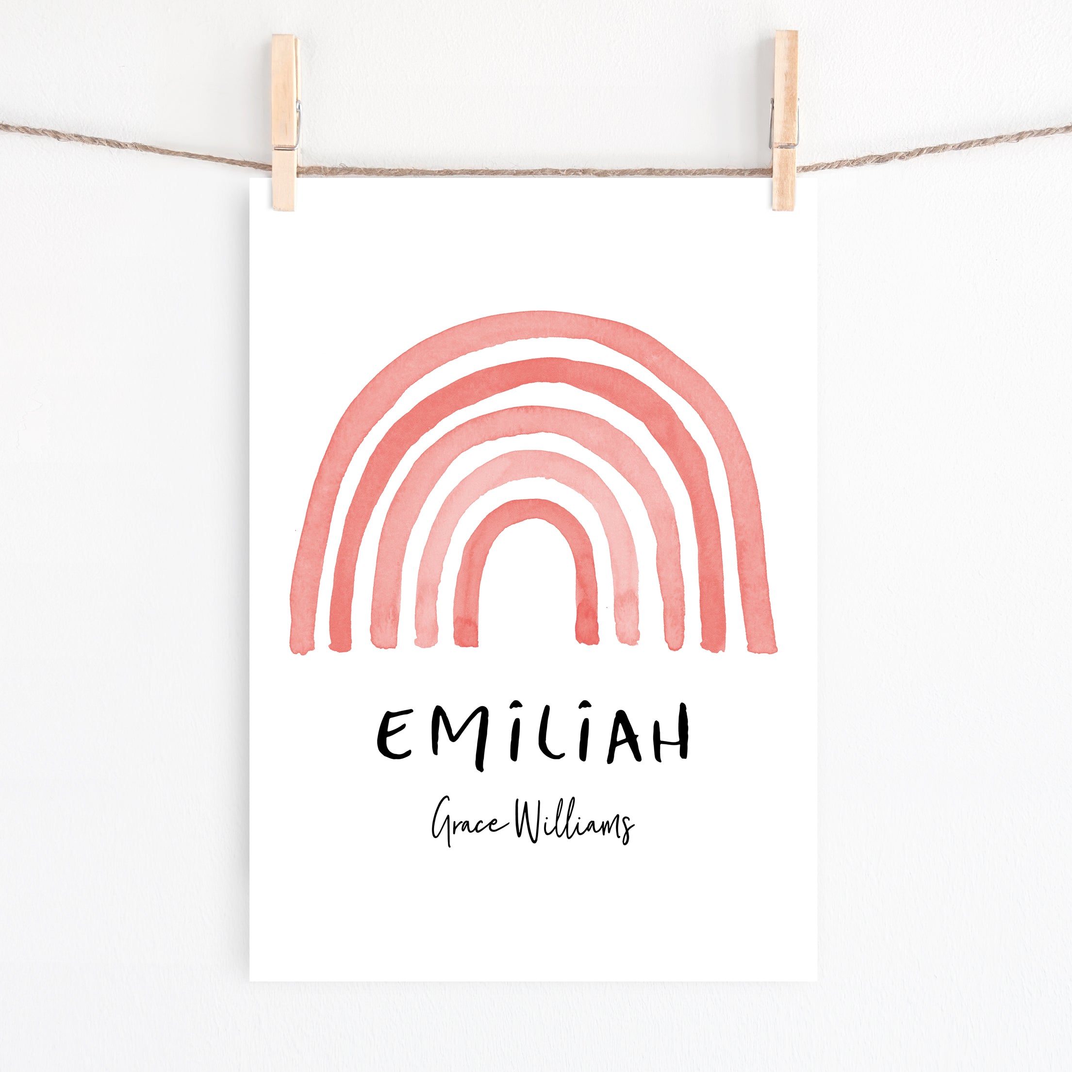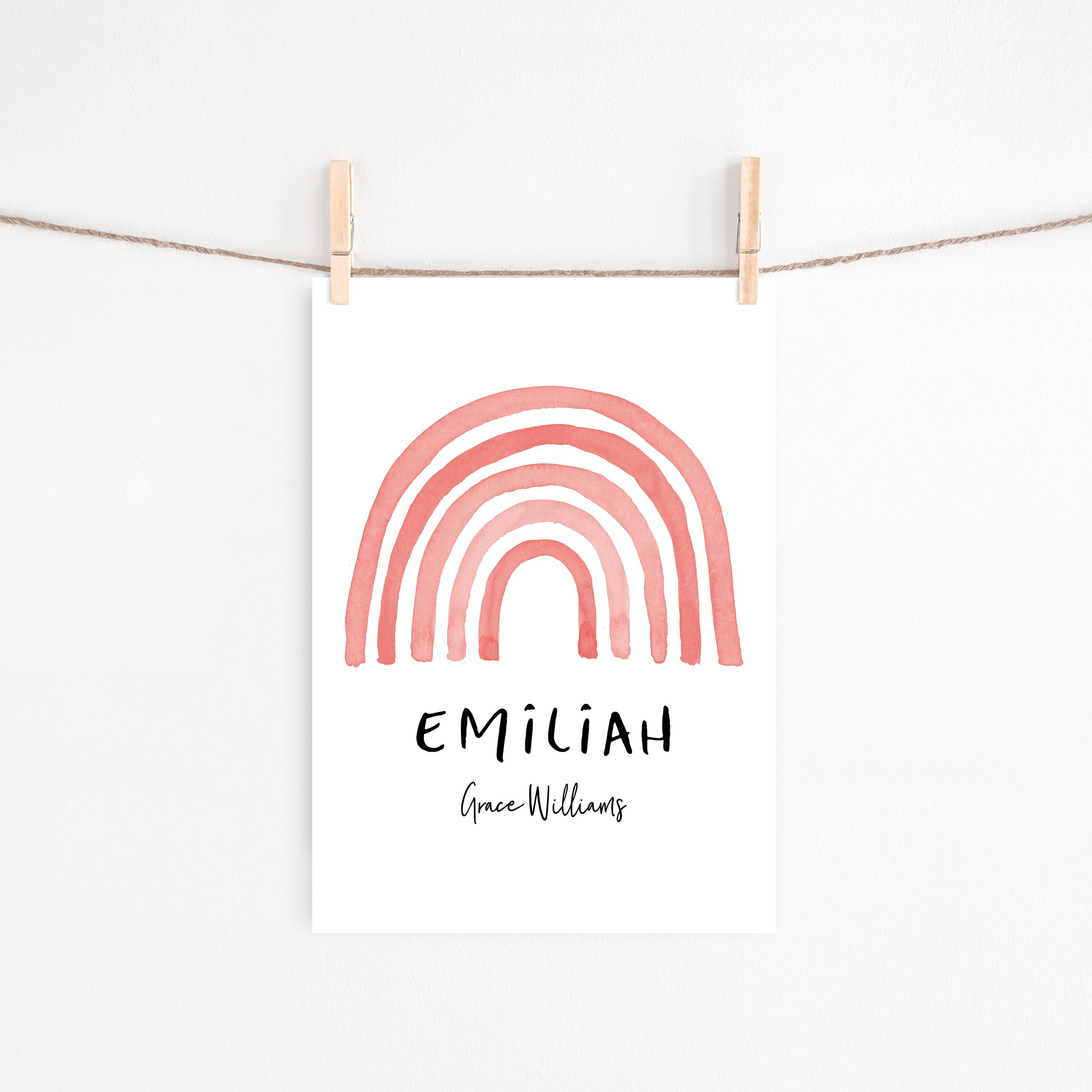A muted watercolour rainbow wall art print, personalised with your child's name, or whatever details you would like included. A perfect new baby gift, or a great way to add the finishing touches to your own child's nursery or bedroom space.
