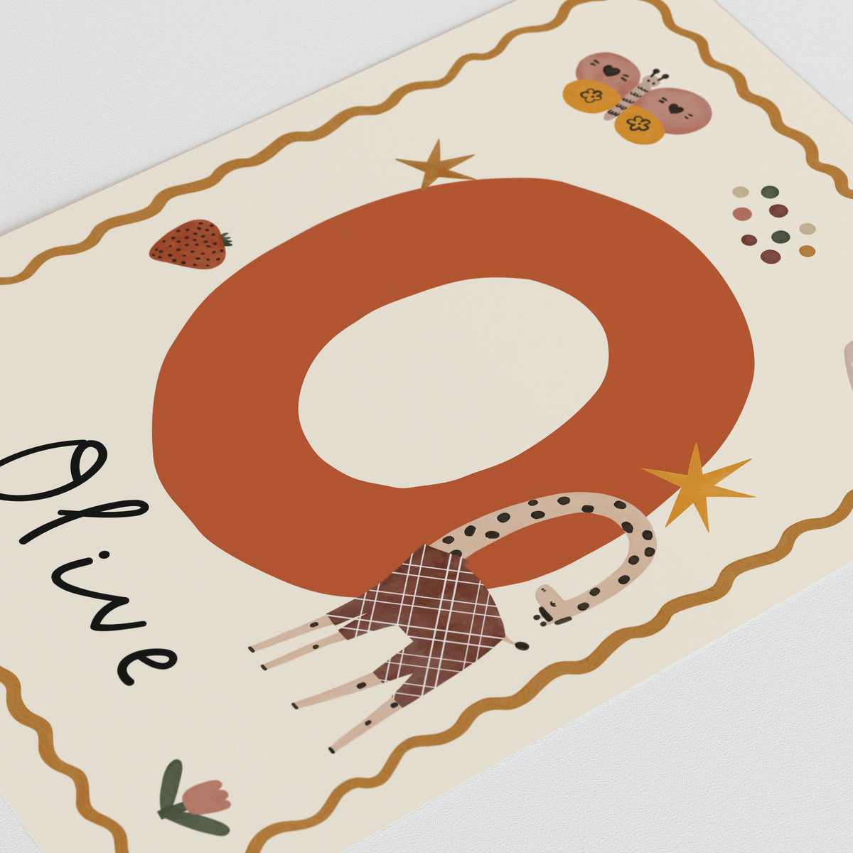 Bring charm and sweetness to your little one’s space with this personalised nursery print, featuring your choice of letter and surrounded by whimsical details — a friendly giraffe, a smiling butterfly, golden stars, and soft floral accents.