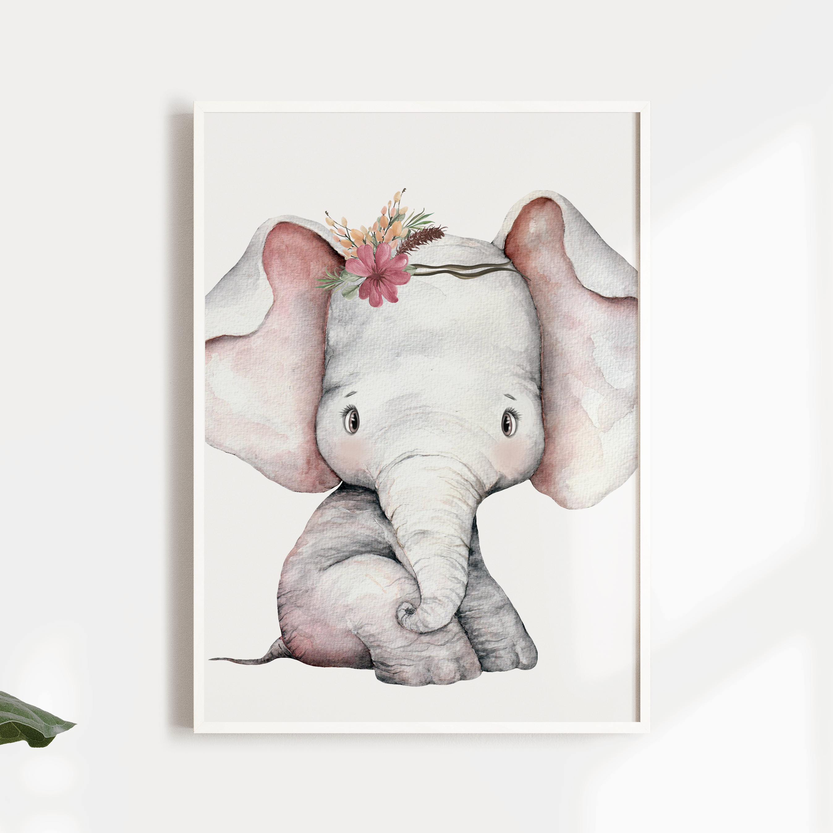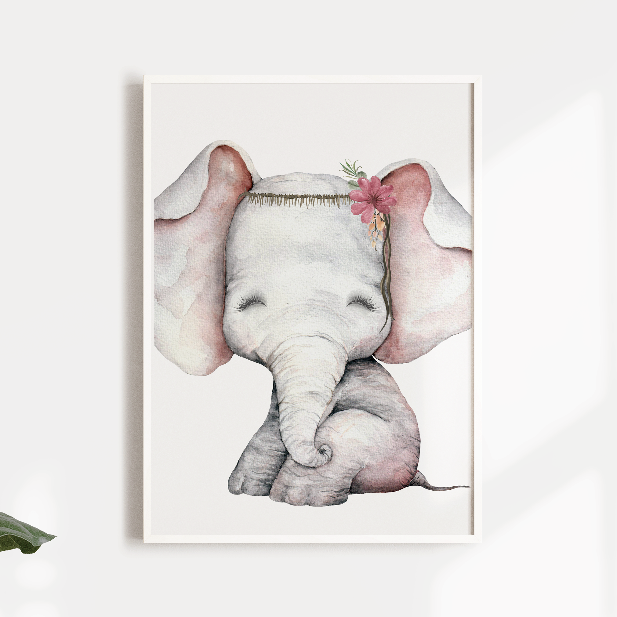 This set of three prints features a customised birth print and two boho woodland elephant prints, all complimented with floral accents.