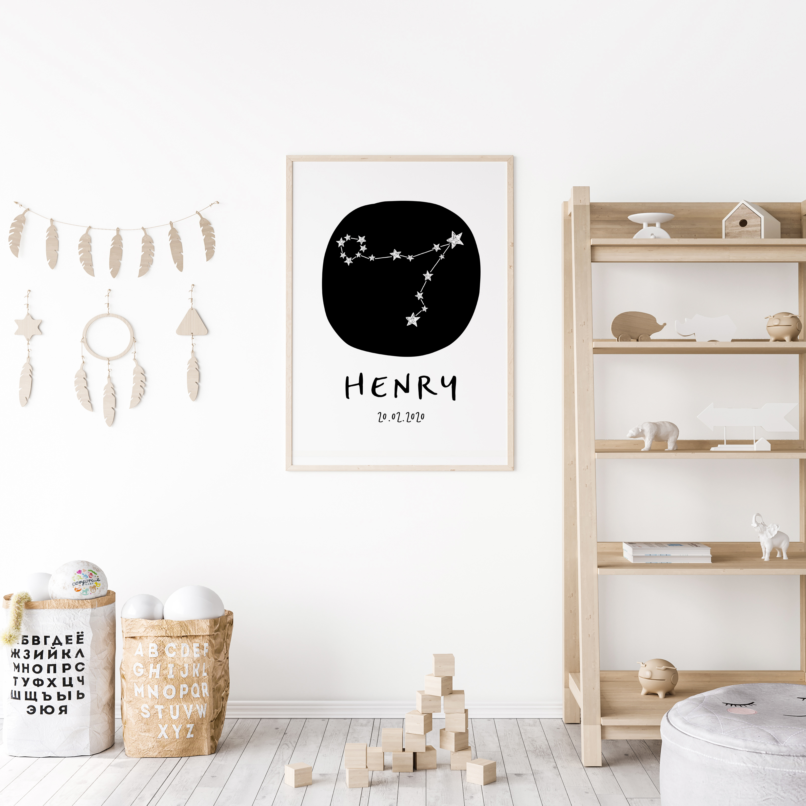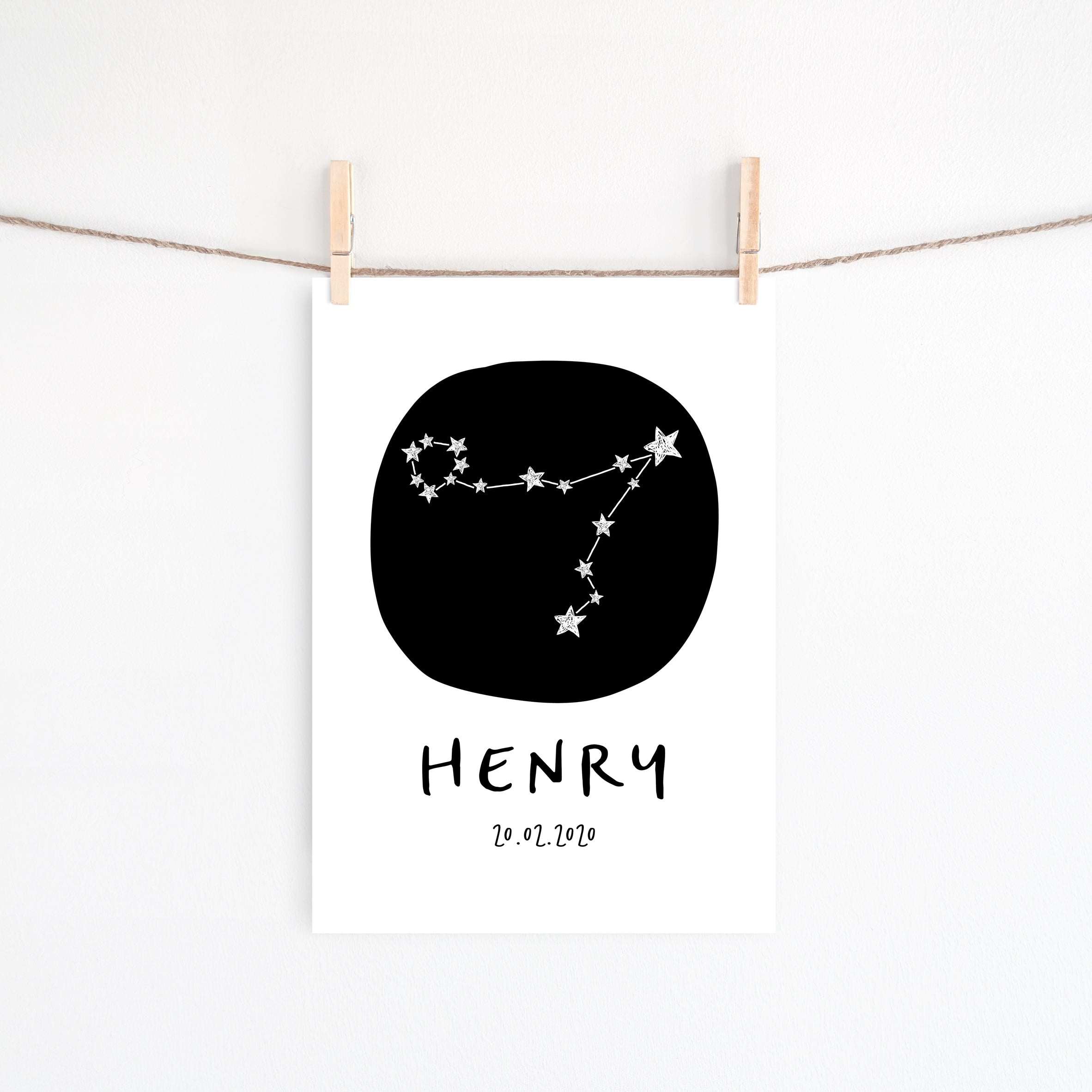 A customised name and birth date wall art print, featuring the Pisces star sign constellation. A statement piece for the monochrome nursery or bedroom decor.